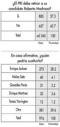 ¿DEBE EL PRI retirar a su candidato a la Presidencia Roberto Madrazo? Los que piensan que sí, sostienen que fue la peor elección que pudo haber hecho el partido. Los que piensan que no, dicen que Madrazo es una garantía de que el PRI perderá por segunda ocasión, y su debilitamiento es saludable para el país. El otrora "invencible" puede caer a la posición número tres, después del PAN y el PRD.