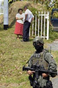 FBI agent stand guard just outside the house of activist Mercedes Rodriguez, seen in the background talking to her lawyer Federico Comas in the western city of Mayaguez, Puerto Rico, Friday, Feb. 10, 2006. FBI agents in Puerto Rico on Friday searched several homes of activists favoring independence for the U.S. island territory as part of an investigation into a militant group, the law enforcement agency said. (AP Photo/Javier Gonzalez)
