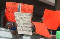 Protesta de comerciantes desalojados del lugar donde se construirá la Plaza Mariana, en la Basílica de Guadalupe, durante la colocación de la primera piedra de la obra