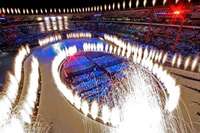 Fireworks light up the stage with athletes seated in the middle as the Olympic flame is lit near the end of the opening ceremony of the Turin 2006 Winter Olympics in Turin, Italy, Friday, Feb. 10, 2006. (AP Photo/Kevork Djansezian, Pool)