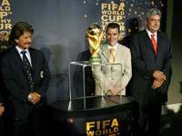 From left, Fifa World Cup spokesman Thomas Von Ubriszy, Marketing Director of Coca Cola in Mexico Ignacio Ruiz and President of Mexico's Soccer Federation Alberto de la Torre poses with the Fifa World Cup trophy in Mexico City, Friday, Feb.10, 2006. The trophy is on a tour through Latin America. (AP Photo Claudio Cruz)