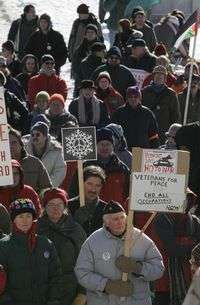 Activistas contra la guerra convergen en la ciudad de Montpelier para una marcha del ayuntamiento a la gubernatura, donde visitaron a funcionarios del estado estadunidense de Vermont para exigir la inmediata retirada de Irak de las tropas de Estados Unidos