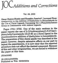 Copia de la retractación publicada en Journal Organic Chemistry. A la derecha, Eusebio Juaristi
