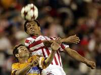 Fabiano Pereira, del Necaxa gana el balón al tigre Antonio Sancho