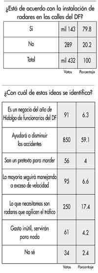 UNA GRAN MAYORIA de los automovilistas y peatones del Distrito Federal están de acuerdo con el funcionamiento de radares en las calles y avenidas para sancionar a los que corren a alta velocidad. También hay quienes piensan que las autoridades harían mejor en dar algún tipo de educación vial. Y aún hay personas que dicen que no tardará mucho en aparecer la corrupción, cuando llegue el momento de pagar las multas.