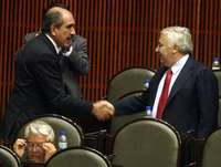 Ampliar la imagen Los legisladores Pablo Gómez, del PRD, y Emilio Chuayffet, del PRI, ayer durante la sesión ordinaria de la Cámara de Diputados en donde se acordó que la Suprema Corte revise el caso del gobernador de Puebla, Mario Marín Foto: Francisco Olvera