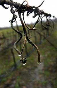Una rama de vid gotea en Ditchling Common, al sur de Inglaterra. La incipiente industria del vino inglés se están revolucionando ya que varios agricultores están cambiando sus cosechas y dejando de sembrar trigo para cultivar uvas para obtener vino
