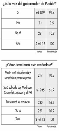 ES SU VOZ, DICE la inmensa mayoría de los participantes en la antiencuesta de esta semana, respondiendo a una pregunta: ¿la grabación pertenece a la conversación del gobernador de Puebla, Mario Marín, y el rey de la mezclilla? Sin embargo, aunque el testimonio lo convierte en presunto responsable de varios delitos, también la gran mayoría piensa que burlará la justicia. Será salvado por el Partido Revolucionario Institucional (PRI), Madrazo, Chuayffet, Jackson, la poderosa maquinaria priísta.