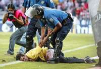 Un aficionado es detenido por la policía tras saltar a la cancha, durante el partido de ayer en el estadio Jalisco