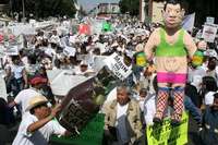 Puebla, Pue., 26 de febrero. Los primeros miles que arribaron al zócalo, y lo colmaron, iniciaron un minuto de silencio en memoria de los mineros fallecidos en Coahuila, pero no hubo más de 10 segundos sin sonido, porque comenzó a escucharse, primero como murmullo y luego retumbando, la voz del enorme contingente que seguía avanzando hacia la plaza, sin saber lo que ahí pasaba: ''¡Fuera Marín, fuera Marín!'', clamaban, estremeciendo a quienes los escuchaban. Las reproducciones de las caricaturas de La Jornada eran los íconos favoritos, incluso construyeron una piñata con...