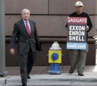 Ampliar la imagen El ex presidente ejecutivo de Enron, Kenneth Lay, a su llegada a la corte, en el caso de fraude y conspiración. A la derecha un manifestante contra las empresas energéticas Foto: Ap