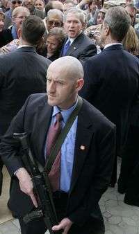 Un agente del Servicio Secreto estadunidense con un rifle de asalto protege a Bush y personal de la embajada de Estados Unidos en Nueva Dehli