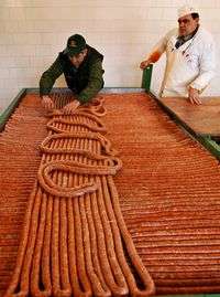Ampliar la imagen Comida profunda. Carniceros de Serbia y Montenegro dan los toques finales a un chorizo de dos mil 22 metros que prepararon en Turija. Los cocineros buscan romper un récord Guiness Foto: Ap