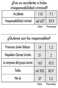 NO FUE ACCIDENTE; lo sucedido en la mina de carbón Pasta de Conchos, de Sabinas, Coahuila, podría calificarse como un "homicidio industrial". En opinión de mil 437 de las personas que encuestamos esta semana la responsabilidad la comparten el secretario del Trabajo, Francisco Javier Salazar; el cacique sindical, Napoleón Gómez Urrutia, y los dueños de la mina. Sólo 110 personas externaron la opinión de que fue un accidente.