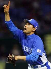 El lanzador surcoreano Park Chan-ho celebra la victoria de su equipo