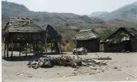 Caserío de la comunidad indígena de Cantiles, municipio de Santa María del Oro, que sería arrasado por los avances de las obras de la presa que se construye en esa región nayarita. A la derecha, plantón de familias indigenas afectadas