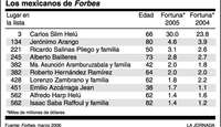Slim Helú, principal accionista de las empresas que controlan casi en su totalidad los servicios de telefonía fija, móvil e Internet en México, subió en el último año del cuarto al tercer lugar en la lista de multimillonarios elaborada anualmente por la revista Forbes. Los 10 mexicanos incluidos en el listado, los mismos que en 2004, acumulan una riqueza de 50 mil 800 millones de dólares, un incremento anual de 19.5 por ciento, variación 5.5 veces superior al del crecimiento de la economía del país en ese periodo.