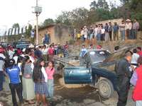Habitantes de Atlautla observan el vehículo donde explotaron juegos pirotécnicos que serían usados en el mitin de Toburcio Bautista, candidato del PT a la alcaldía