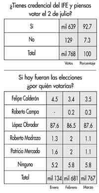 En la antiencuesta de marzo enviamos por correo electrónico 5 mil cuestionarios a un grupo igual de personas entre los 7 mil 600 usuarios registrados en nuestro foro. El 99 por ciento llegó a sus respectivos buzones sin problemas técnicos. Habían sido contestados hasta las 17 horas de ayer 36.4 por ciento (mil 767 votos efectivos). El registro muestra 62 votos para Calderón, 4 para Campa, mil 548 para López Obrador, 30 para Madrazo y 20 para Patricia Mercado. Adicionalmente, esta ocasión presentamos un resumen comparativo de los sondeos de enero, febrero y marzo, con base en el número de votos registrados y el porcentaje de la votación que correspondió a cada candidato.