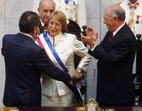La socialista recibe la banda presidencial de manos del titular del Senado, Eduardo Frei Ruiz-Tagle; Ricardo Lagos (derecha) aplaude