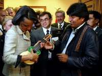 Condoleezza Rice recibe en Valparaíso un charango obsequiado por el presidente Evo Morales, durante la asunción de Michelle Bachellet