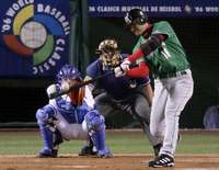 El mexicano Luis Alfonso García conecta jonrón en la tercera entrada del partido contra Corea del Sur, en el Clásico Mundial de beisbol que se realiza en Anaheim, California