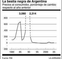 Una historia de espirales hiperinflacionarias hace que los aumentos de precios en Argentina sean particularmente delicados. Kirchner ha declarado que el control de precios será su prioridad para 2006. (Miceli, quien antes de tomar posesión como ministra de Economía desdeñaba las preocupaciones sobre la inflación como ''un argumento para mantener bajos los salarios'', se ha convertido en un halcón de la inflación.) Hasta ahora, sin embargo, su estrategia ha consistido principalmente en patrocinar pactos de congelamiento de precios por un corto periodo entre detallistas y algunos proveedores. Como de costumbre, estos pactos se han obtenido con el incentivo del apoyo implícito del gobierno en negociaciones laborales futuras o bajo la amenaza de un alza de impuestos. Pero, en apariencia, su cometido inicial es contener las expectativas inflacionarias de corto plazo mientras se logra un prometido retorno a la austeridad fiscal. ''Parece que Kirchner piensa que los empresarios elevan los precios sólo porque nadie les dice que no lo hagan, así que él les dice que no'', afirma el asesor económico Javier Alvarado.