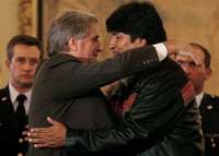 En el palacio presidencial de La Paz, los presidentes de Uruguay, Tabaré Vázquez, y de Bolivia, Evo Morales, se saludan tras signar un preacuerdo sobre comercio de gas natural FOTOAp