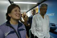 Ampliar la imagen Andrés Manuel López Obrador, candidato presidencial de la coalición Por el Bien de Todos, platica en un pasillo del aeropuerto capitalino con Xóchitl Gálvez, comisionada para los pueblos indígenas, momentos antes de abordar el vuelo MX 111 a Oaxaca Foto: Carlos Ramos Mamahua