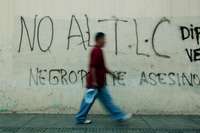 En Tegucigalpa, un grafiti forma parte de la oposición al TLC entre Honduras y Estados Unidos, que fue aprobado por el Congreso y que entrará en vigor el primero de abril