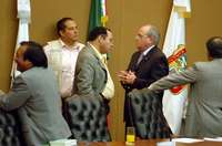 José Núñez Castañeda (derecha), presidente del IEEM, y Rubén Islas, representante del PRD, en un receso de la sesión de conteo de casillas