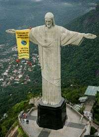Activistas de Greenpeace colgaron una pancarta en favor de la conservación del medio ambiente en uno de los brazos del Cristo Redentor del Corcovado, en Río de Janeiro