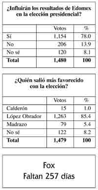 Estoy convencido de que los resultados del estado de México van a influir en la elección del 2 de julio. Considerando que no votó 60 por ciento de la población, me es difícil determinar quién es el favorecido con estos resultados. Tratando de ser objetivo no me atrevería a asegurar que fue López Obrador; hubiera jurado que Madrazo se iría para abajo (caso Marín, la corrupción de Montiel, la renuncia de Eduardo Andrade, la renuncia de diputados priístas, etcétera); aun así, el PRI sigue adelante, aunque bajó considerablemente su votación. De lo que sí estoy seguro es de quién perdió, y ése es Calderón.