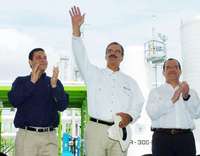 El presidente Vicente Fox, al inaugurar ayer la planta criogénica número tres del complejo procesador de Burgos, en Tamaulipas; lo acompañan el gobernador de esta entidad, Eugenio Hernández Flores, y el director general de Pemex, Luis Ramírez Corzo