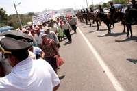 El Tajin, Ver., 19 de marzo. Miles de campesinos totonacas e integrantes del Frente del Totonacapan para la Defensa del Patrimonio Cultural, así como agrupaciones adheridas a la otra campaña marcharon en repudio al festival musical Cumbre Tajín, y bloquearon de manera simbólica el llamado parque temático Takilshukut, que según los manifestantes fue edificado sobre vestigios arqueológicos.