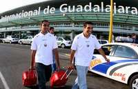 José Fabio (izquierda) y Alex Dias, del Sao Paulo, a su arribo a la ciudad de Guadalajara