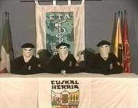 Sentados en una mesa, ataviados con un pasamontañas y con banderas de Euskadi Ta Askatasuna (lema que conforma las siglas de ETA y que significa Patria Vasca y Libertad) y de Euskal Herria, tres miembros del grupo armado leyeron el comunicado de 26 líneas.