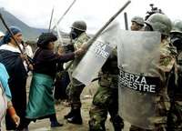 Mujeres indígenas golpearon a soldados cuando llegaron a levantar el bloqueo de carreteras en la provincia de Imbabura, que se había organizado como protesta por el TLC con Estados Unidos