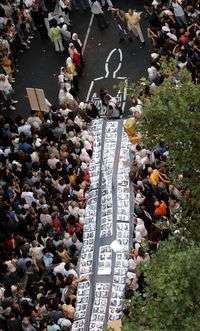 Miembros de Madres de Plaza de Mayo llevan una bandera con fotografías de personas desaparecidas durante la guerra sucia, ayer en la manifestación por el trigésimo aniversario del golpe militar contra Isabel Perón