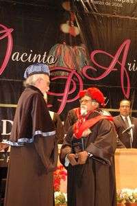 Dijo además que la universidad, que aún no tiene instalaciones propias, entregó el galardón a Arias Pérez "porque queríamos señalar por dónde andamos, queremos dejar claro el camino que la institución pretende seguir, y nos enorgullece mucho que sea la primera vez que una universidad mexicana reconoce a un científico social indígena de la categoría de Jacinto".