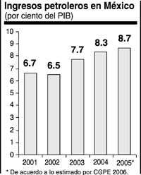 Las entradas por exportar crudo representaron 8.7% del PIB en 2005, según Hacienda