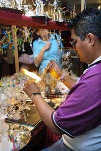 Elaboración de figuras de vidrio en la feria artesanal instalada en la explanada de la delegación Benito Juárez