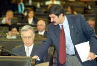 Los senadores Manuel Bartlett, del PRI, y el panista Javier Corral, ayer en Xicoténcatl