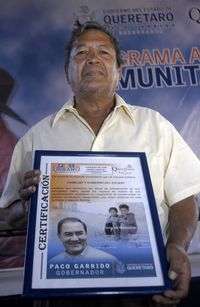 Querétaro, Qro., 5 de abril. El gobernador panista Francisco Garrido Patrón entrega a representantes de colonos documentos del Programa Acción Comunitaria en los cuales aparece su fotografía con los colores de su partido y el logotipo oficial de la administración estatal, para certificar que cumplió el compromiso de entregar obra pública y que los ciudadanos contribuyeron en su realización.