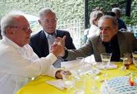 El cineasta Julio García Espinosa saluda al nobel Gabriel García Márquez ante la mirada del embajador de Cuba en México Jorge Bolaños
