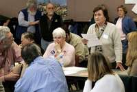 Durante un mitin del Partido Demócrata en Vermont, la representante Margaret Lucente (de pie) señaló que el presidente George W. Bush ha engañado a Estados Unidos sobre la guerra, ordenado espionaje ilegal y violado los tratados internacionales contra la tortura