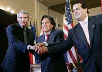 El representante comercial de Estados Unidos, Robert Portman; el presidente de Perú, Alejandro Toledo, y el ministro peruano de Comercio, Alfredo Ferrero Díez Canseco ayer en Washington