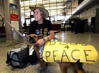 Cyndy Sheehan y otros activistas planifican protestas en Semana Santa contra la guerra en Irak cerca del rancho del presidente George W. Bush en Crawford, Texas, se inform� ayer. En la fotograf�a, la dirigente pacifista acaricia a su perro Luna en el aeropuerto de Waco FOTO Ap