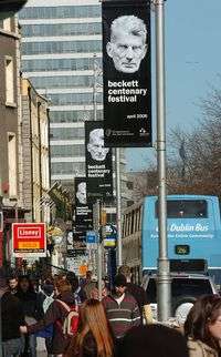 Una calle de Dublín, en el sur de Quays, rebosa de carteles para anunciar el festival conmemorativo por el centenario de Samuel Becktett (1906-1989); a la derecha, el célebre autor que llevó al escenario el desamparo del hombre moderno y lo absurdo de su existencia
