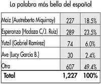 HAY 20 MILLONES de palabras en nuestro idioma, de acuerdo con el Gran Diccionario de Uso del Español Actual, de don Aquilino Sánchez Pérez, catedrático de filología en la Universidad de Murcia. Habría que añadir los mexicanismos y algunas expresiones que hemos incorporado de las lenguas indígenas. Seleccionar entre todas la más bella es una tarea que se antoja imposible. Aun así, al parecer la más bella sería esperanza, de acuerdo con la propuesta de algunos foristas. En el cuadrito aparecen algunas de las palabras más votadas, así como los nombres de las personas que las propusieron.